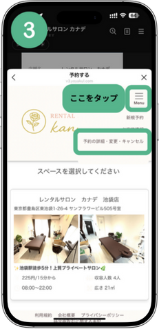 - 右上にある3本線を押して「予約の詳細・変更・キャンセル」をタップしてください。