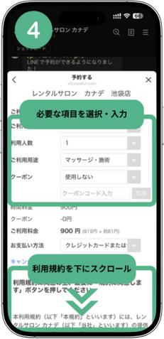 - ご利用時間、ご利用人数、ご利用用途、クーポン、お支払方法等を選択